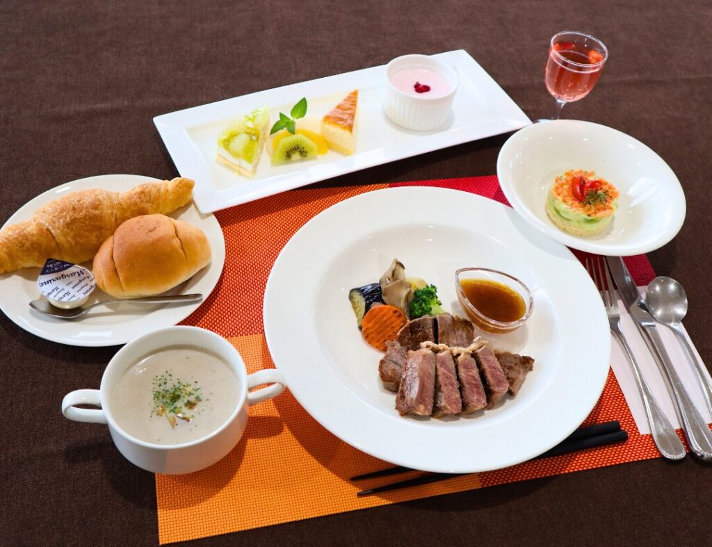 テーブルには前菜から始まる洋食のコース料理が一皿ずつ並び、メインはステーキ。最後には華やかなデザートの盛り合わせが登場します。