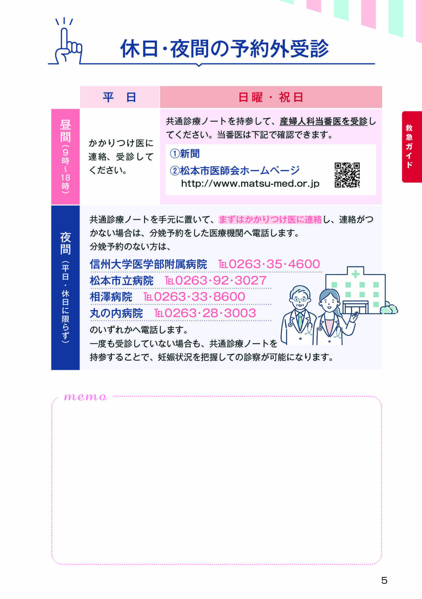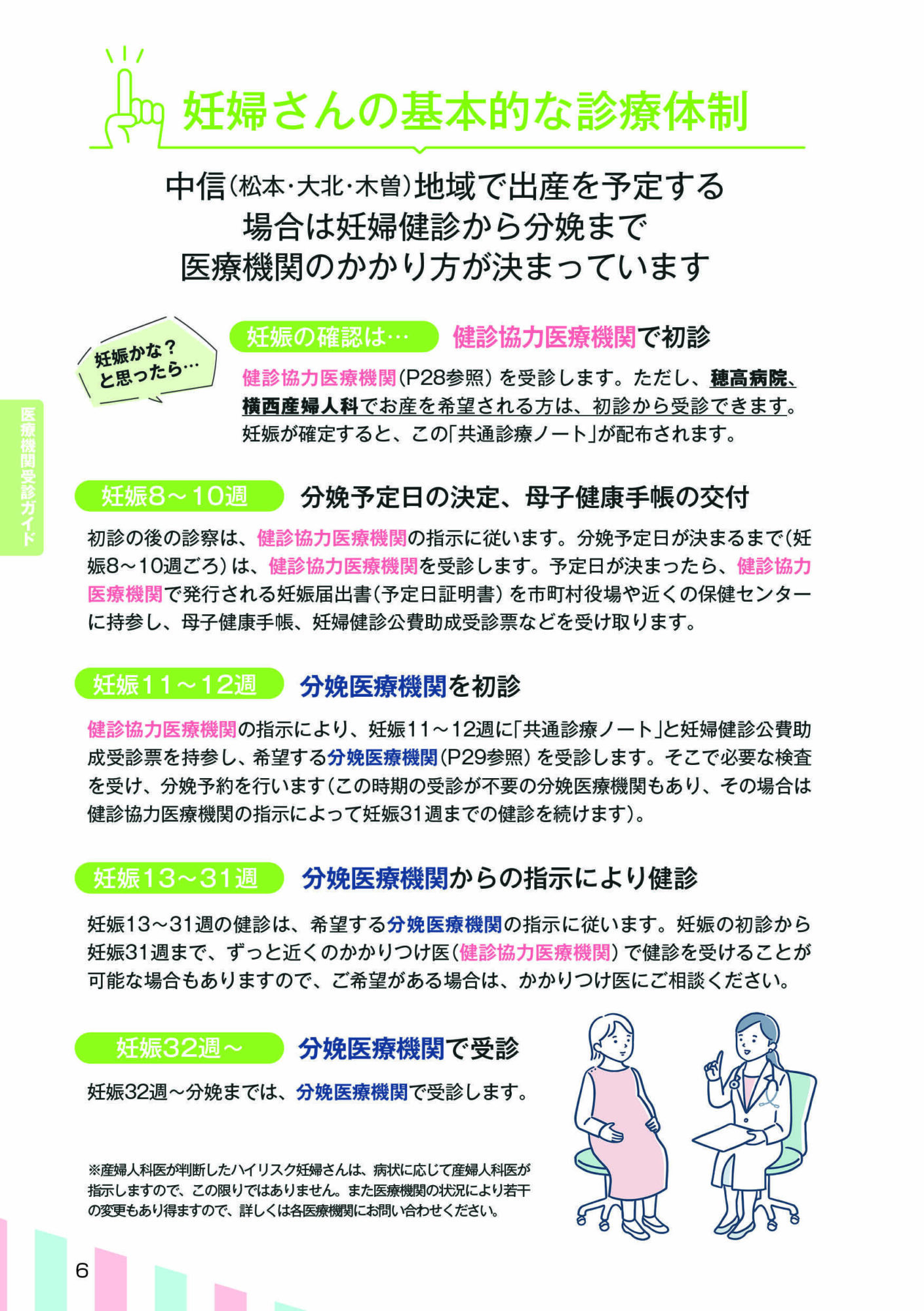 原則として、健診協力医療機関と分娩医療機関で役割分担を行っている中信地域において、医療機関の間での情報共有や妊娠中の皆さんが不安なく妊娠期間を過ごしていただくために必要な情報が記載されています。