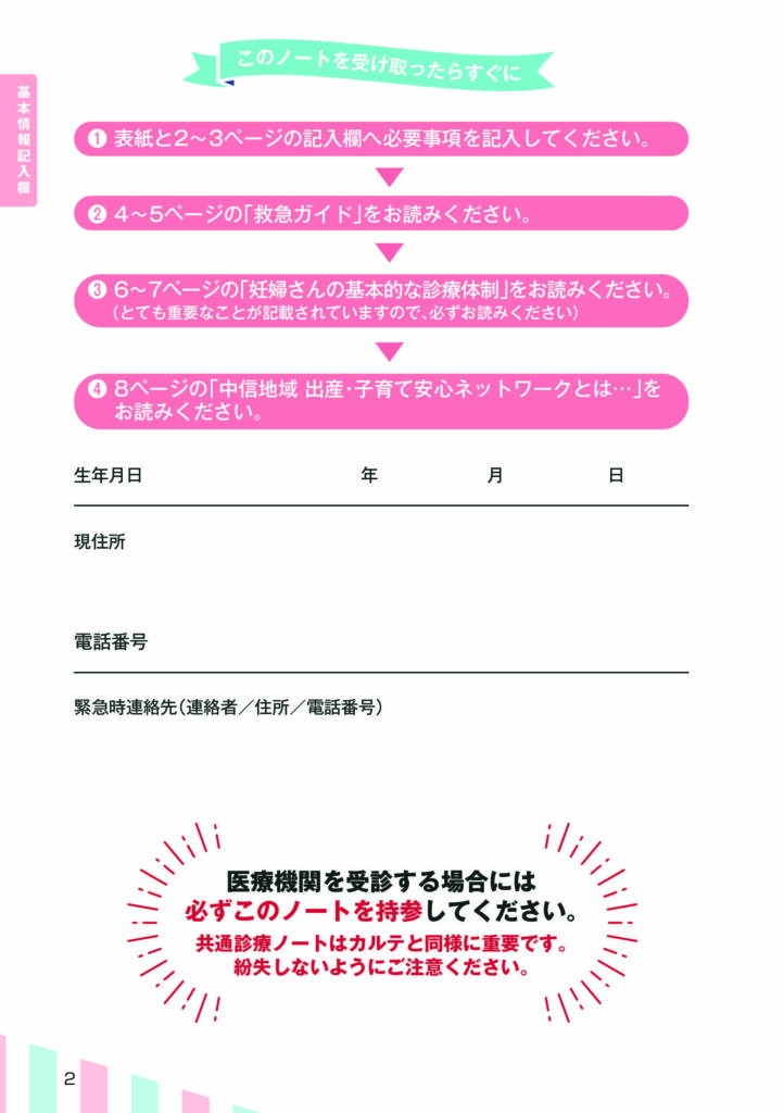 共通診療ノートは、中信地域で妊娠が確認された妊婦さんに配布されるノートです。