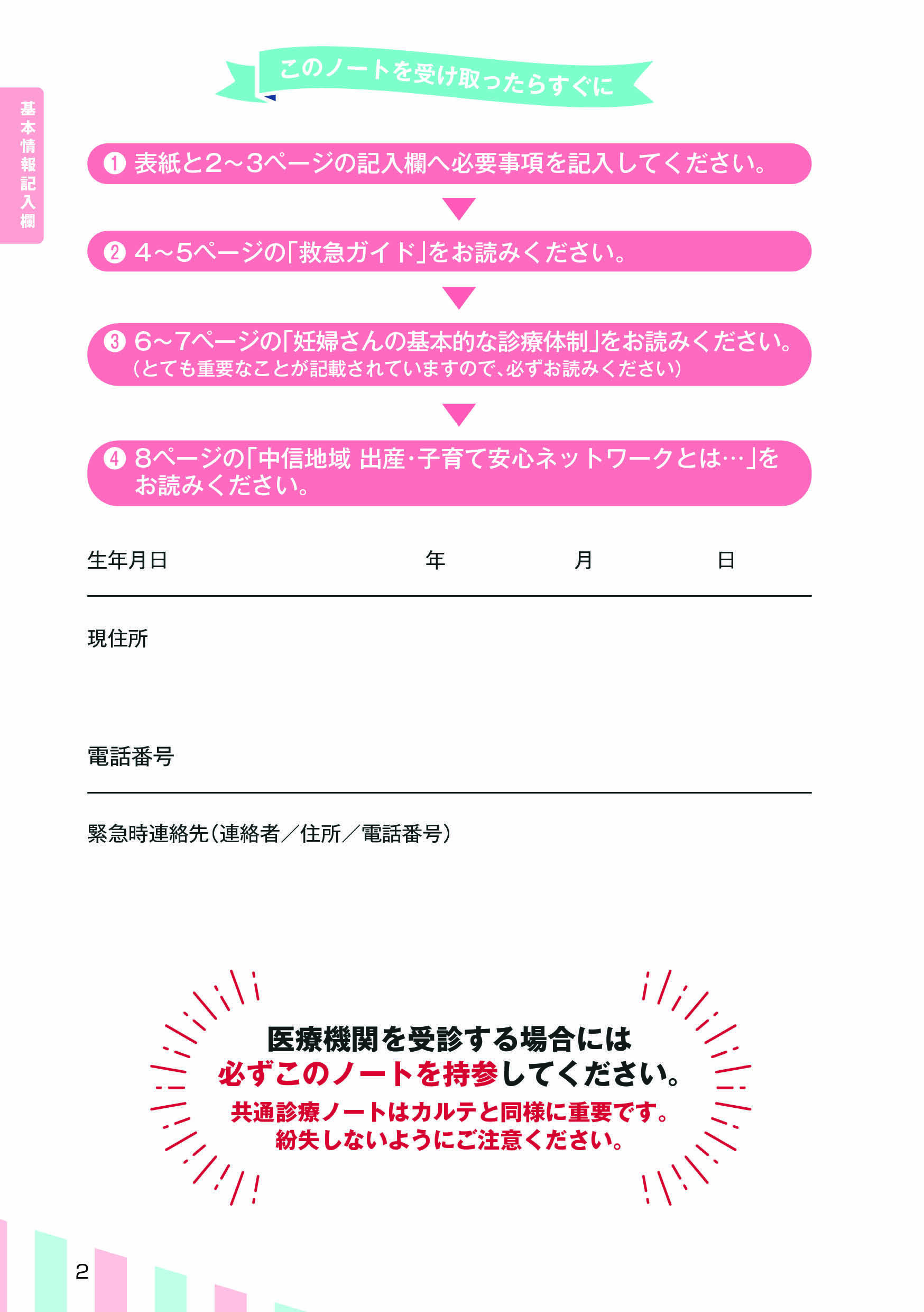 また、中信地域以外で里帰り出産する場合にも分娩予定の医療機関にご持参いただくと、担当医師が妊娠の経過を把握することに役立ちます。